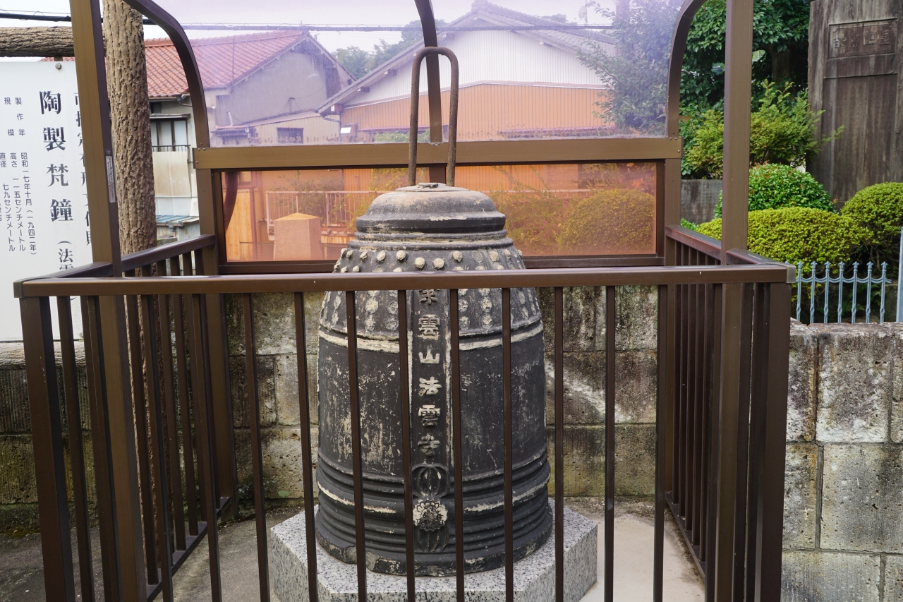 法雲寺の見どころは陶製の梵鐘。鐘楼があるのでそこかと思ったら、そのそばの地面に置いてありました。昭和17年の金属回収令によって供出された梵鐘に代わって造られたものだそう。実際に使われたかどうかは分かりませんが、これをぶら下げて、なんとか穴を埋めたということでしょうか。確かに、形は梵鐘そのままです。