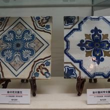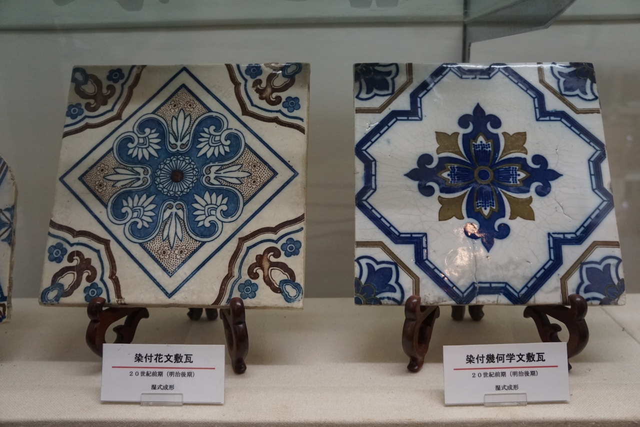窯垣の小径資料館は、窯垣の小径の一番奥。入ってすぐから焼き物の展示があって、目を引いたのは染付のタイルのような敷瓦の作品。明治中期頃のもののようですが、その美しさは驚異的。技術的なものよりも、このセンスはどこから来たものなんでしょうか。その後につながっているのか分かりませんが、ちょっと突然変異のような感じもする。これにちゃんと目を付けて、ここで保存していることにも最大限の敬意を表したいと思います。
