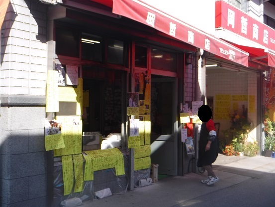 コロッケの有名店があるということで行って見ると、肉屋さんと並んで紙が一杯貼られた店が。まず肉屋さんでコロッケを頼むと、隣だよと。隣の店頭の紙は、取材をたくさん受けたPR?おふだ?