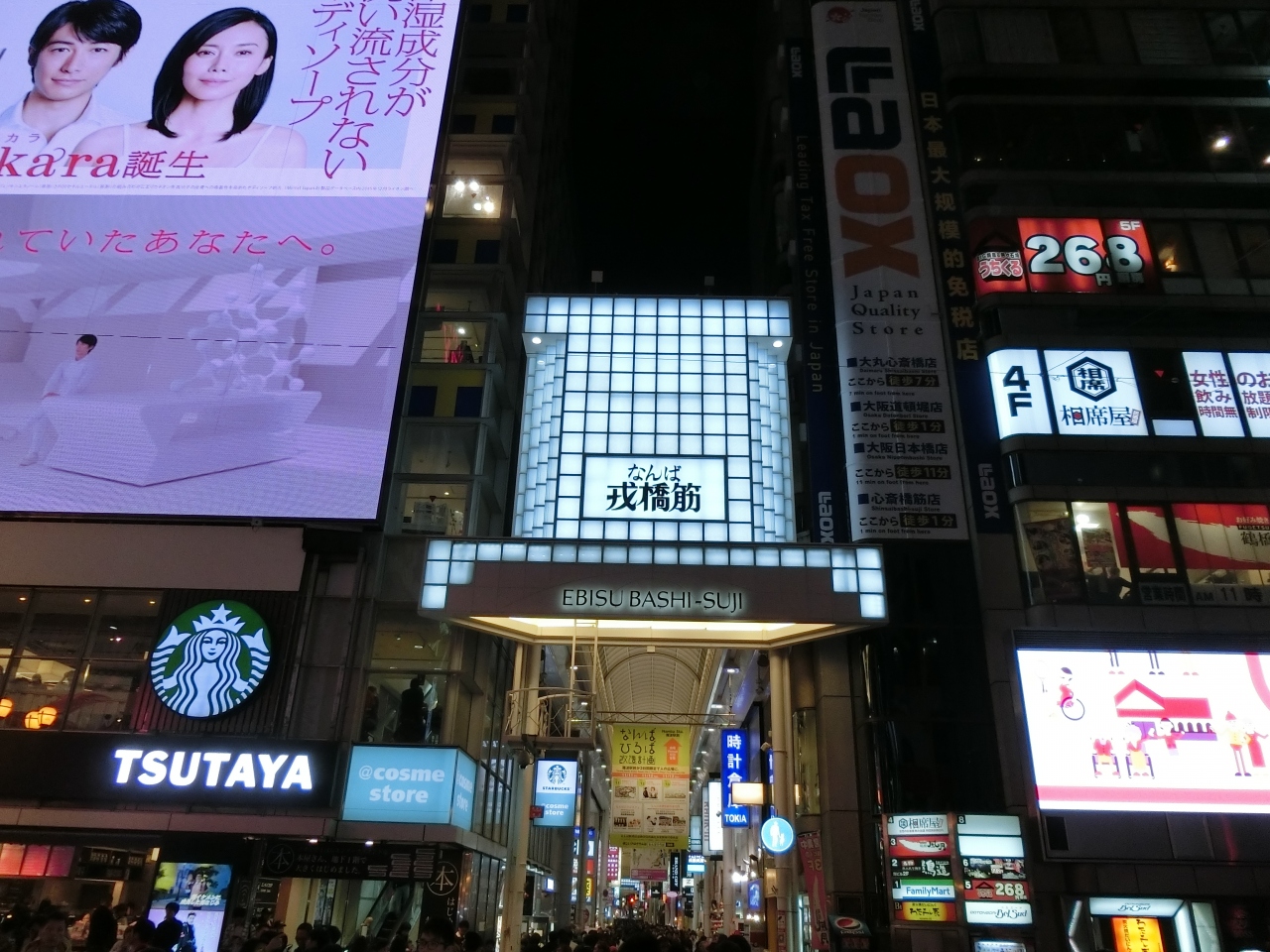 道頓堀の戎橋から先にある商店街です。人通りが多くて活気があり、大阪らしい雰囲気を堪能することが出来ます。飲食店もたくさんあり、食べ歩きも楽しそうですが、とにかく人でごった返していて大変でした。外国人も多かったです。屋根のあるアーケード商店街なので、雨が降っても散策が楽しめます。