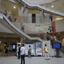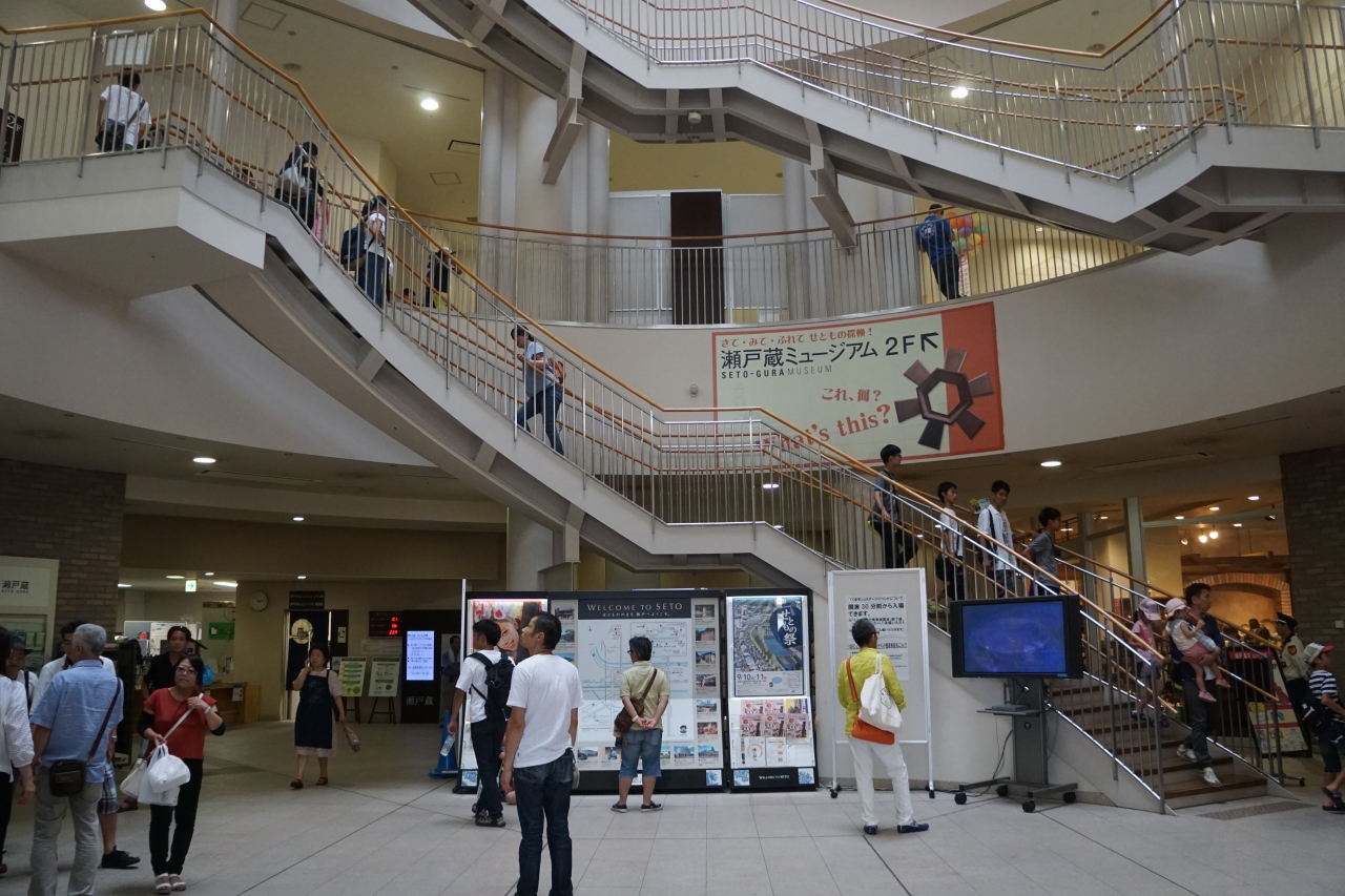 瀬戸蔵は、一階の陶磁器販売所と二階のミュージアムがウリなんですが、入るといきなり巨大な吹き抜け空間があって、この建物自体が見どころかもしれません。大勢の観光客が入ってきても全然問題なし。周辺も気持ちの良いスペースとなっていて、せともの祭りの会場としても大活躍の様子でした。