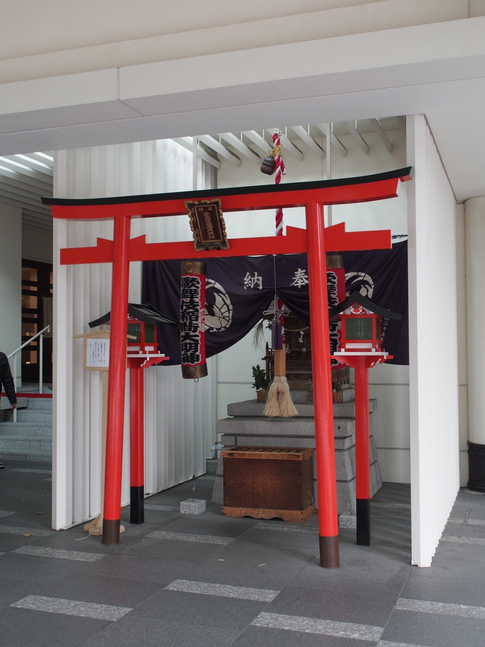 今回、歌舞伎座の建物をしみじみ見て回っている途中で、敷地の片隅に小さな鳥居があることのにはじめて気づきました。歌舞伎の名を冠したお稲荷さんで、大切にされている感じがうかがえます。