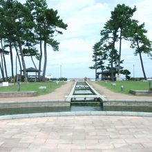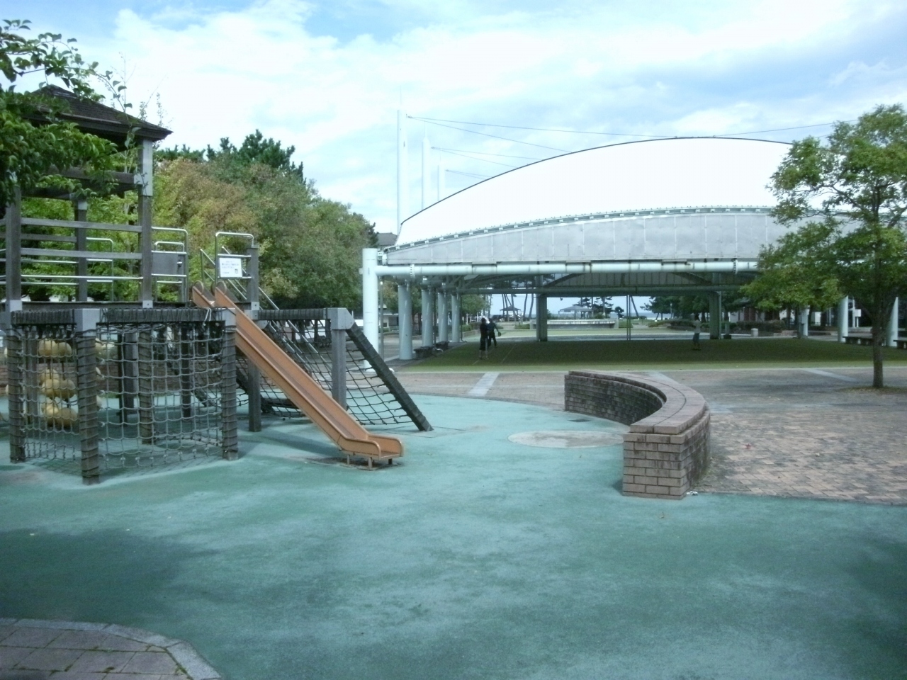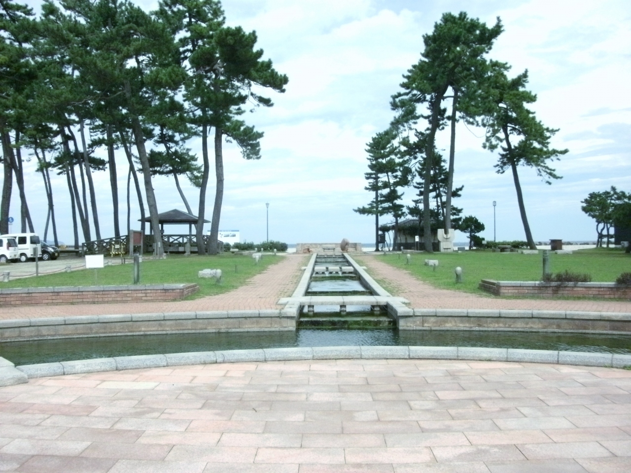 温泉街の中心近く、県道300号線に面したところから海に向かって幅50m、奥行200mほどの広さがある公園です。県道側に近い位置は、子供向けの遊具や屋根付きゲートボール場、東屋等があるゾーンになっていて観光客にとってはそれほど利用価値はないと思いますが、県道から入って奥の方(海の方)に無料で利用できる足湯があります。海を見ながら入る足湯はなかなか気持ちが良かったです。ここから海岸遊歩道に出られますので、温泉街散策時には立ち寄られることをオススメします。