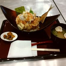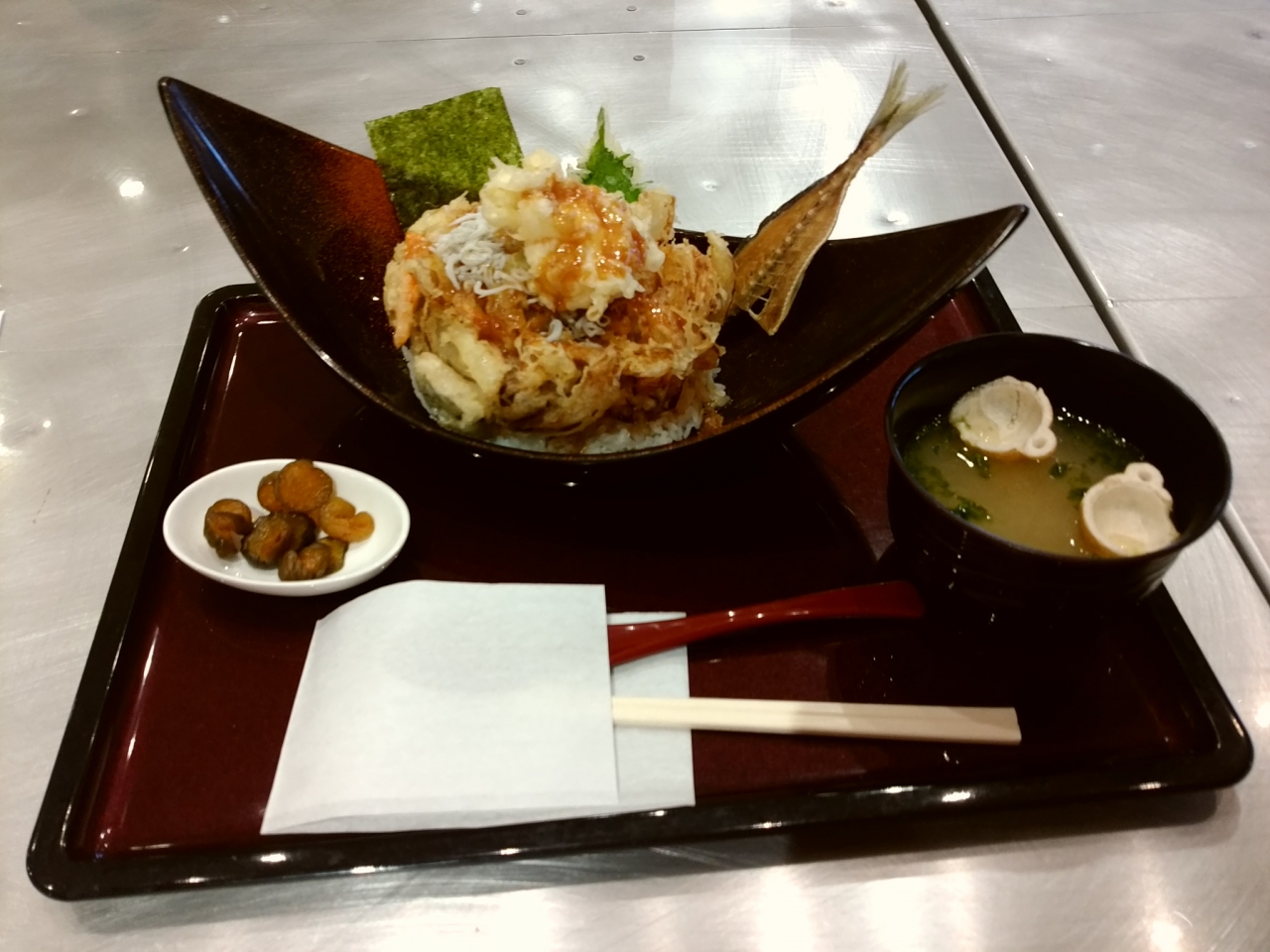 そんなこんなで席を見つけてからフードコートをぐるりとまわって、牛タンと迷いましたが、かき揚げに引かれて温玉天地魚かき揚丼(870円)を注文し待つことしばし。