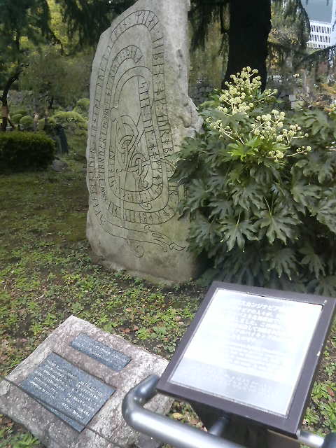 ヘビのような模様が描かれていて古代壁画か何かと思いきや、スカンジナビア・バイキングが使っていた古代北欧文字を刻んだもの、という説明がそばの案内板に書かれていました。