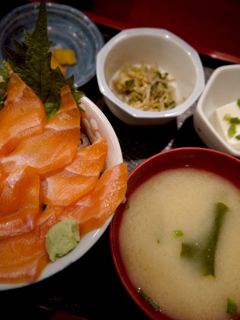 サーモンの刺身は丼の上にまであるが、丼が深いので、かさ上げの為にご飯の量が多い。どこまであるんだ、と思ってしまった程。当然ながら、満腹感がある。