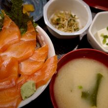 その名の通り、ご飯の上にサーモンの刺身がこれでもか、とトッピングされている。