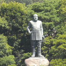 銅像は、道の突き当り(丁字路)のような場所にあり、城山をバックに鹿児島港の方を見渡している感じです。