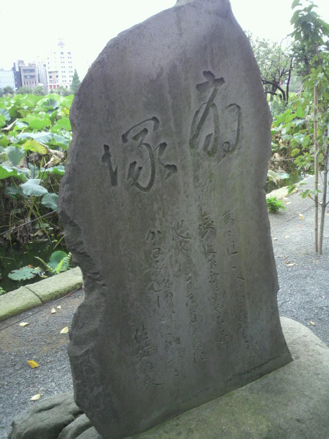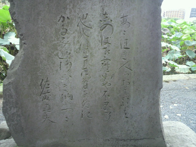 碑面には、佐藤春夫の名が刻まれた「ああ、佳き人の面影を、偲ばざらめや、しのばずの、池のほとりに香を焚き,形見の扇、細めつつ 」とあります。