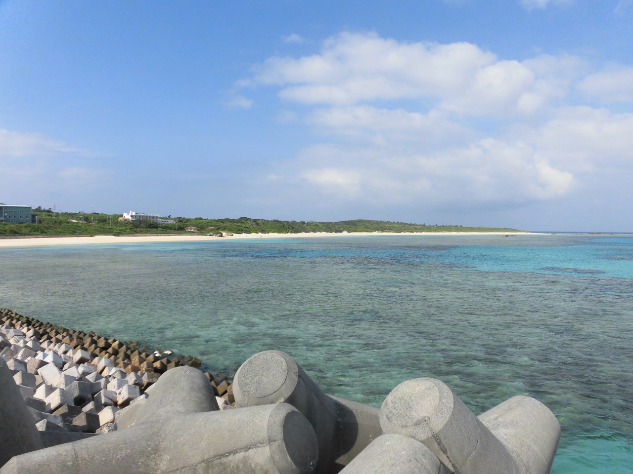 港にある堤防にのぼって、ニシハマ方面を見ると、びっくりするほど青い海が見られて、とてもテンションが上がりますよ!