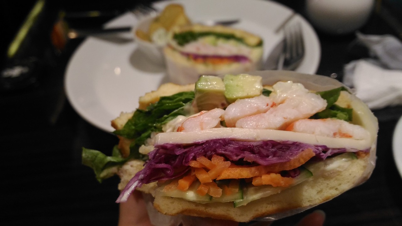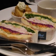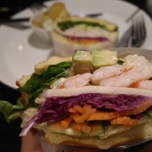 海老とアボカドフレッシュ野菜のサラダサンドも注文。サンドは、ワッフル生地に挟まれていました。野菜たっぷり。添え物のポテトには、バジルのサワークリーム。スープはポテトのクリームスープ。こちらも生クリームがたっぷり入っている感じでかなりまろやか。