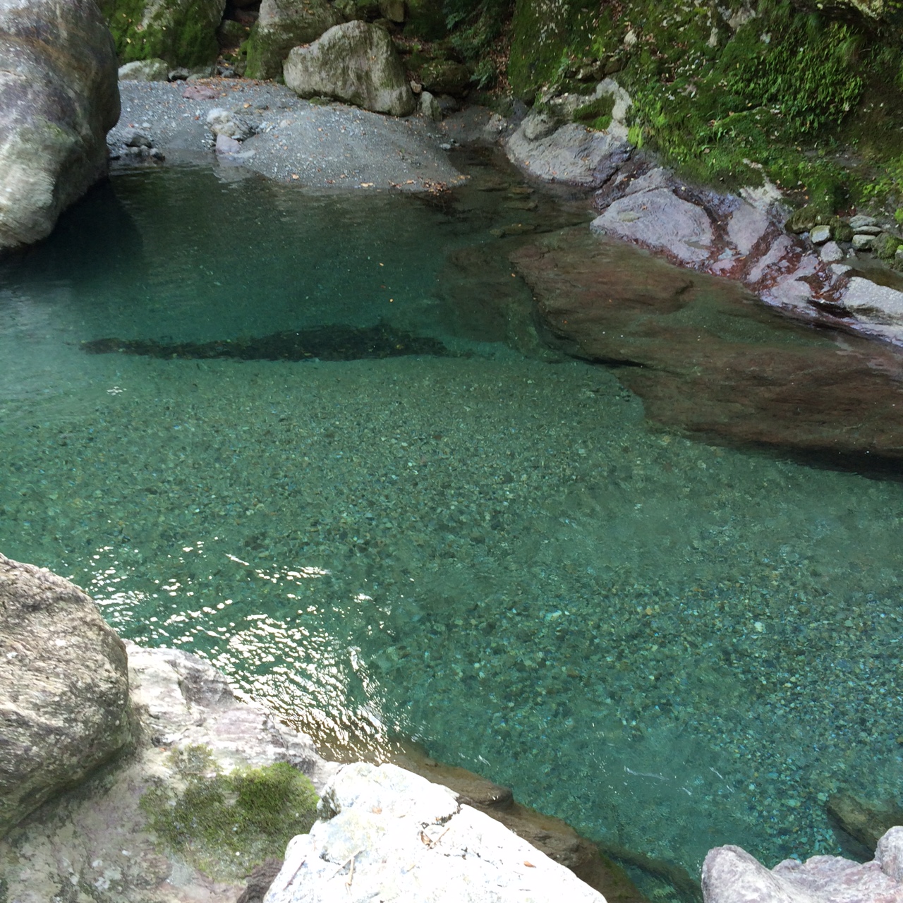 松山空港から車で行きました。2時間かからなかったと思います。水の透明度は高く、エメラルドグリーンでとてもキレイです。あまり時間がなかったので、途中の東屋のようなところで引き返しましたが、そこまでの遊歩道がアスレチック的で楽しかったです。紅葉のシーズンだったからか近隣に臨時駐車場もあり、観光しやすかったと思います。