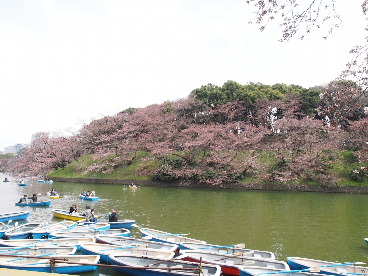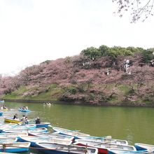 ボート乗り場のところにデッキがあって、手漕ぎボートとお濠、桜の組み合わせが楽しめます。