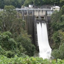 中央に8門の洪水吐ゲート、両側に排砂ゲートがあってたいへん重厚な印象を受けるダムでした。ダム堤上は残念ながら立入禁止になっていましたが、排砂ゲートから放水されている様子を見ることができてよかったです。管理所のそばに、駐車場やトイレがあります。