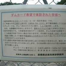 ダムを見学後、管理所に立ち寄ってダムカードを頂けるようお願いすると、快く応じてくれました。ダム詳細の説明資料があればよかったのにと思いました。なお、職員の方の業務の都合によって対応していただけない場合があるそうで、その時のダムカードの配布方法について現地にあった表示板の写真を添付しますので参考にしてください。