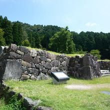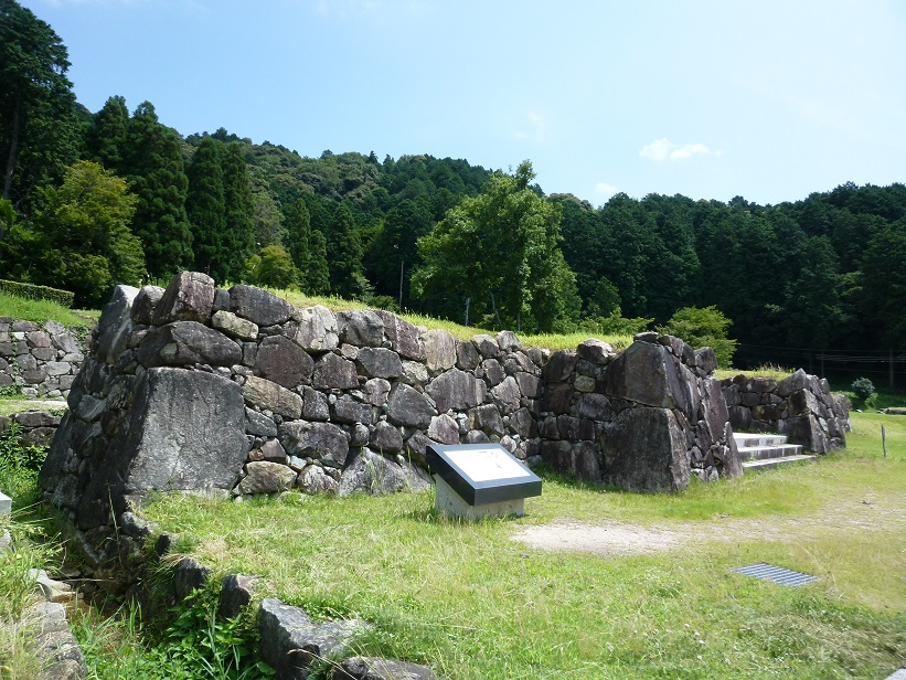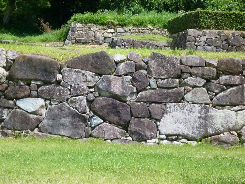 安土城大手道の右手の高い石垣は平成13年に復元されたものです。大手道は道幅が広く山腹まで180mほどの直線に伸び突き当りを西へ曲がっています。