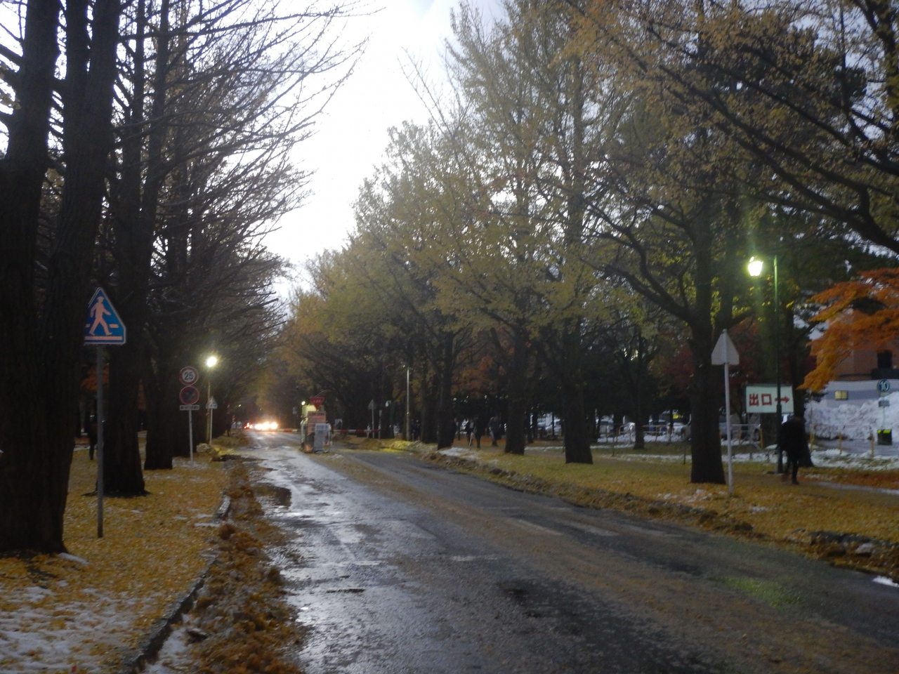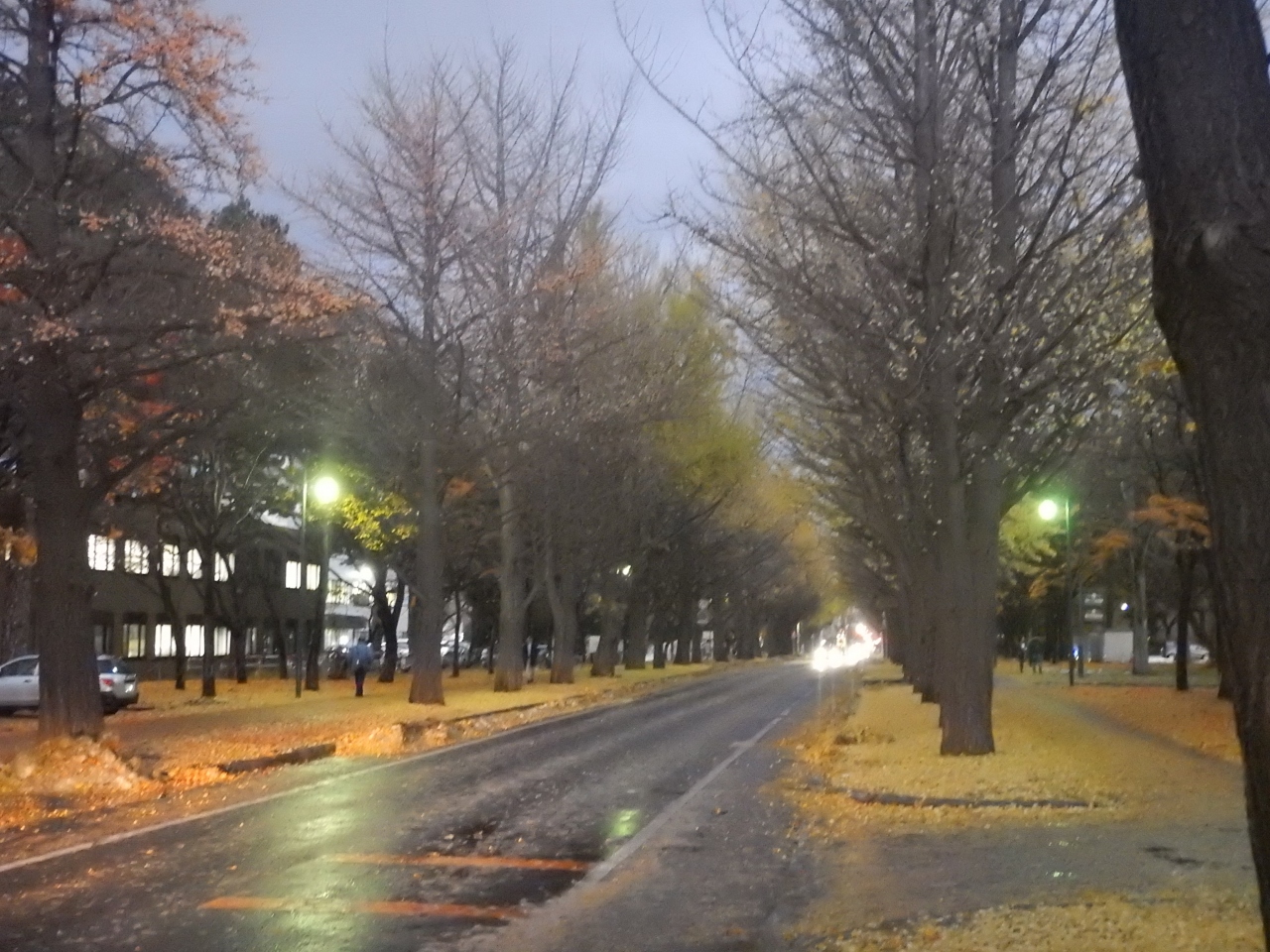 この日も午後から札幌在住の友人に案内してもらい、夕方に北大構内を歩くことになった。イチョウの葉は数日前の積雪で大分落ちてしまい、歩道は葉で埋め尽くされたいた。緯度が高いため、4時半だというのにもうかなり暗くなっていた。シャッター速度も低速なのでやや写真はブレている。。