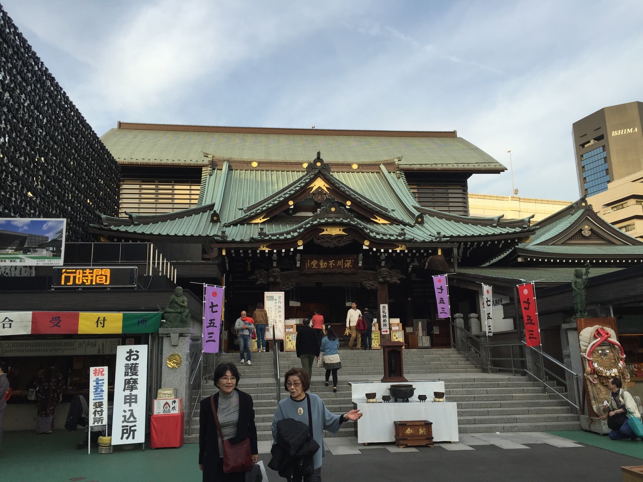 門前仲町駅から徒歩5分ほどのところにあります。千葉県成田市にある成田山新勝寺の東京別院で、七五三の旗がたくさんたっていました。厄除け、交通安全の神様のようです。清水建設が本堂の前にあるお寺の建物の工事をしていました。子供連れの方が多かったです。