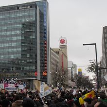 前回は紙吹雪が撒かれましたが、今回はループ化により同通りを通るようになった市電の線路に詰まるということで禁止。