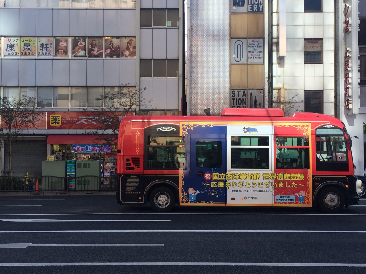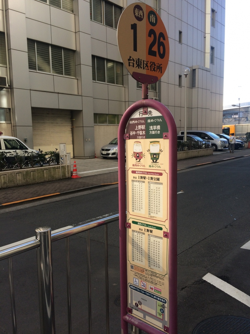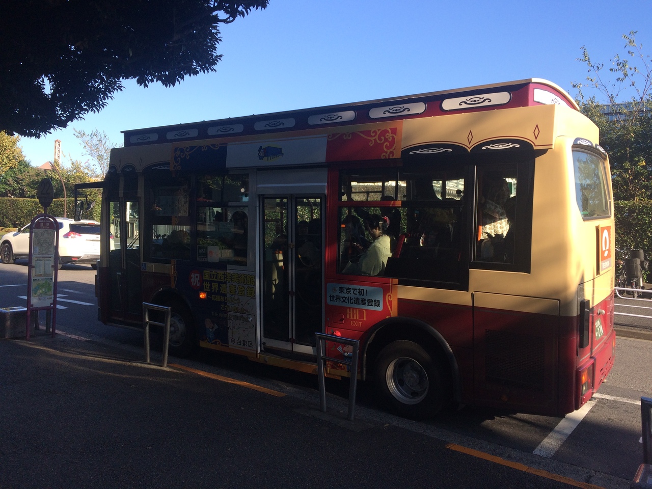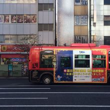 上野界隈の道路でよく見かけ、バス停も結構見かけました。バスは小さめのバスで小回りがきき、ミニカーのような外観です。停留場もおしゃれな絵が描いてあり好感がもてました。1時間に4本程の運行で交通系電子マネーが利用出来ます。
