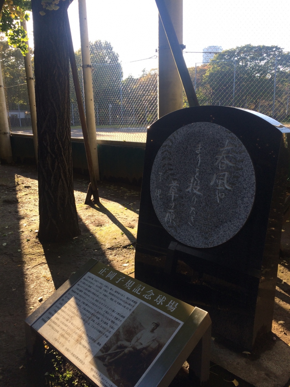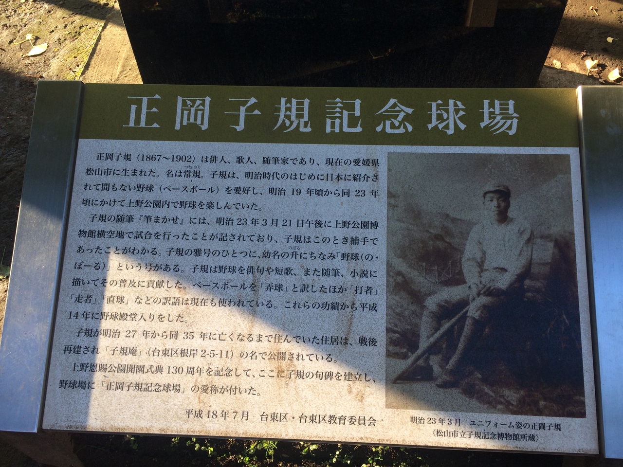 編みに囲まれ現役の野球場で土のグランドでした。上野動物園の近くにあります。野球場の直ぐ横には歌碑と正岡子規の説明と写真がありました。野球の練習や試合はしていませんでしたが近くにベンチもあるので野球を見たかったです。
