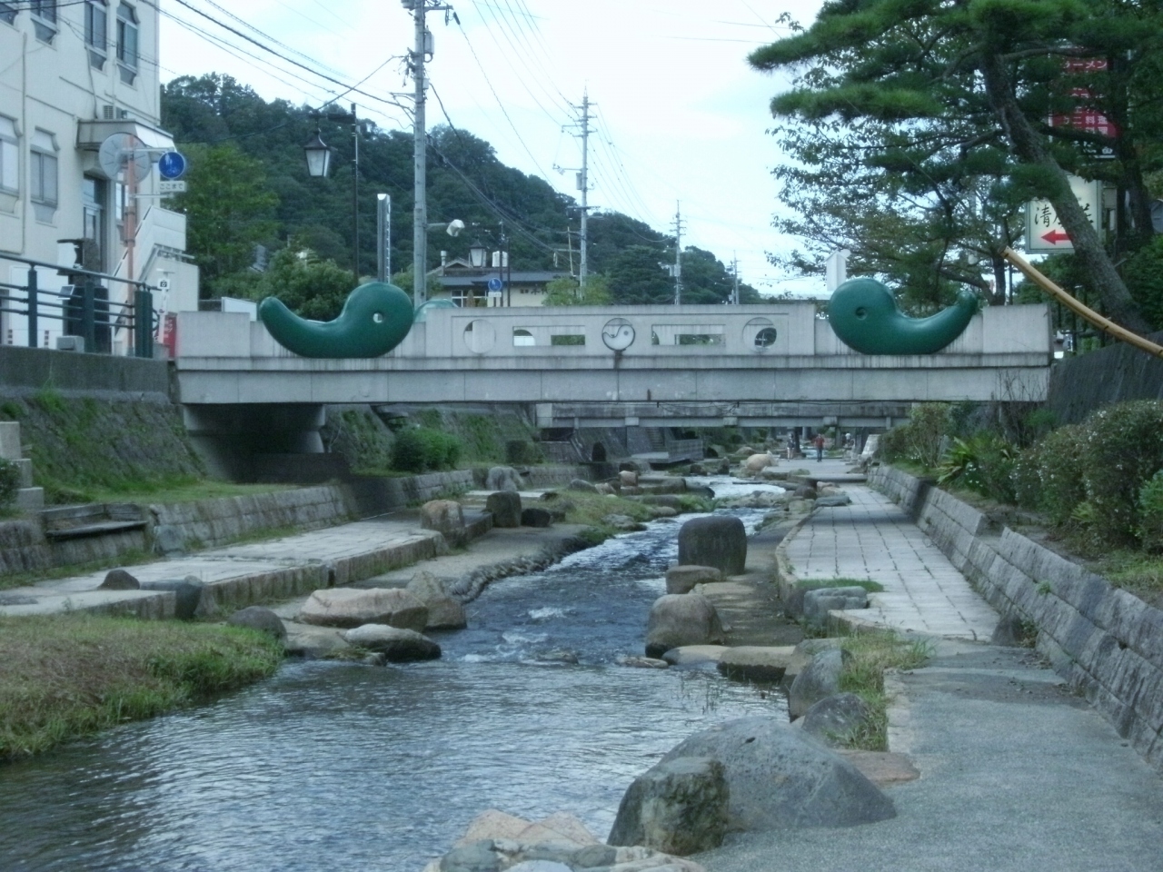 玉造温泉街を流れる玉湯川、川の両側に旅館、ホテルが立ち並んでいます。川沿いや川の中には、観光客を飽きさせないように足湯があったり、神話オブジェが飾られています。