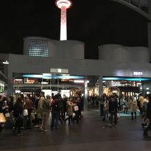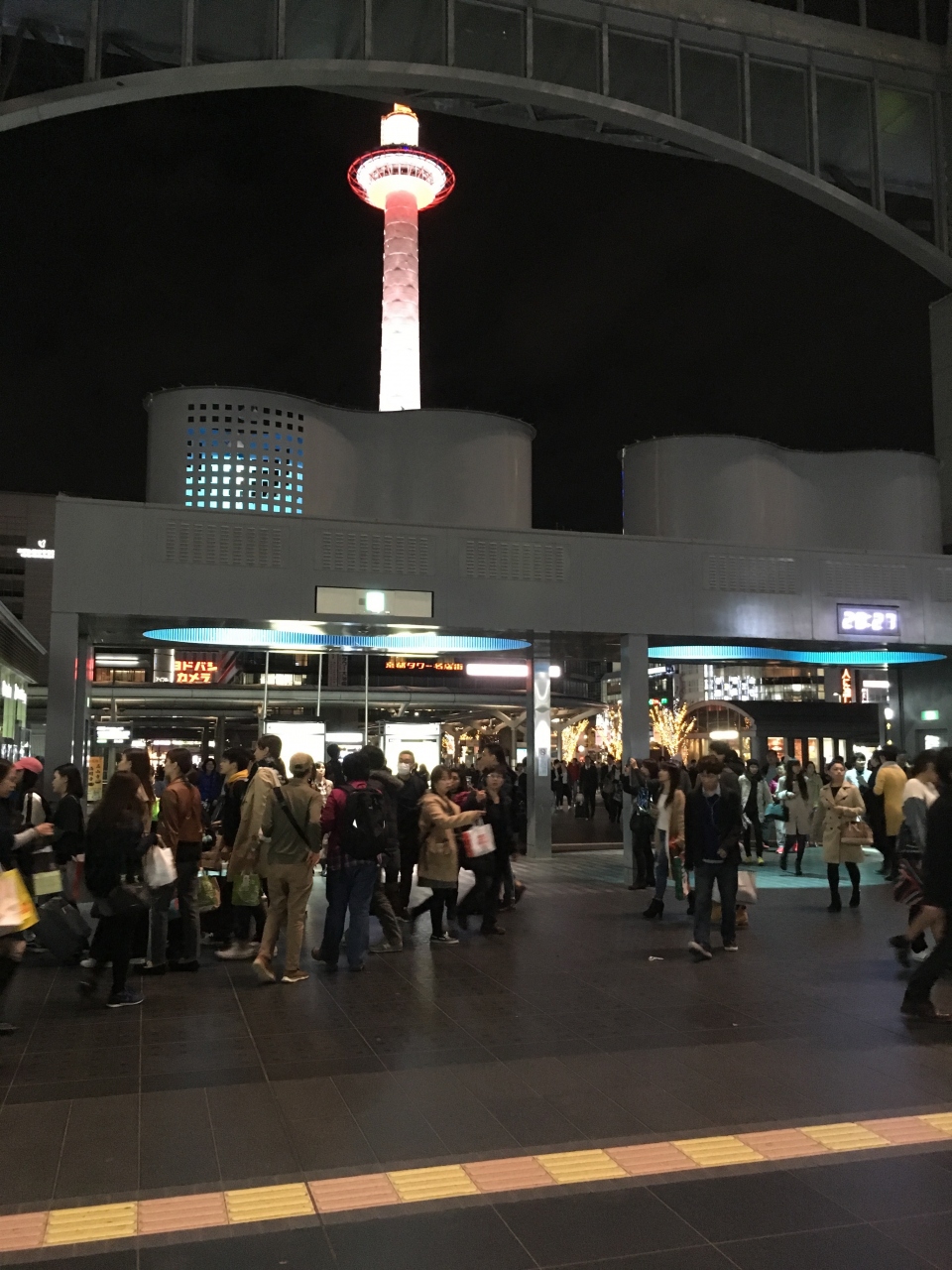 伊勢丹や各小売のお店、そして、大階段がある広場などが一気に集中する京都駅ビル。外観に京都タワーの夜景がうつるのもなかなかおもしろいと思います。京都駅自体かなり大きな駅で、改札が集中していますからいつでも混雑しています。いまは観光シーズンで混雑も尋常ではありません。