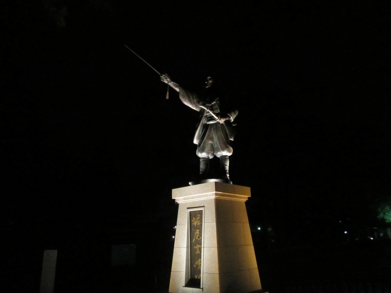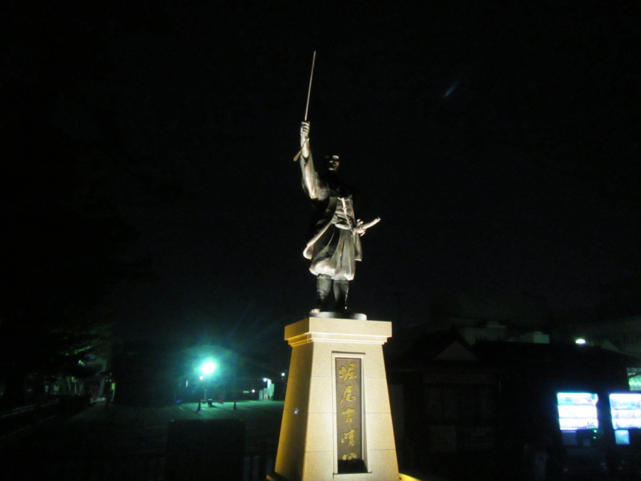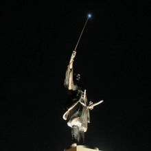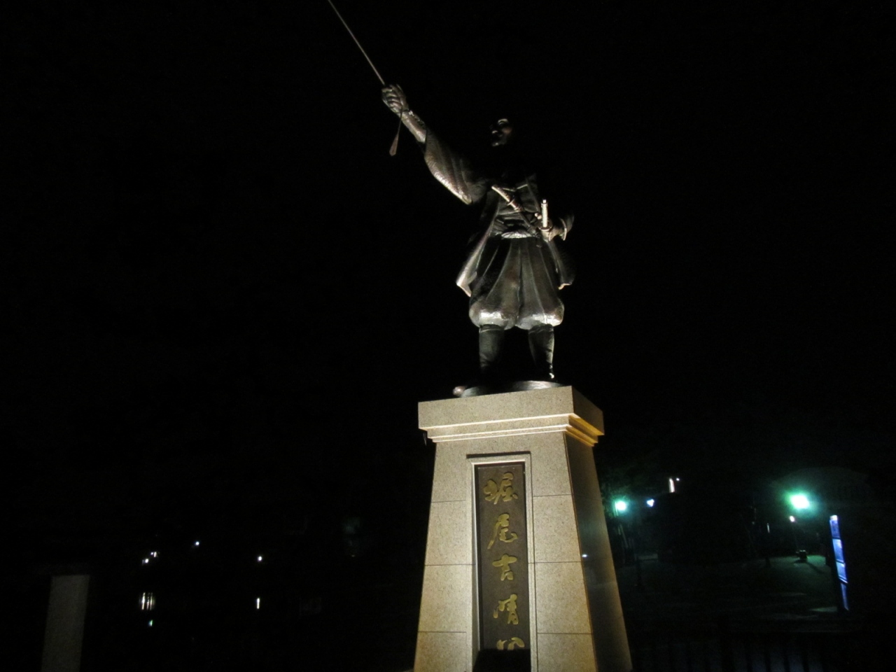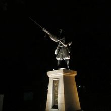 松江城築城の祖で、その姿は天守閣方面を指し示しています。