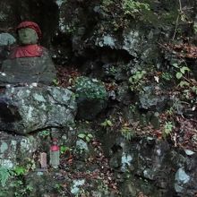 女坂の道端には、いくつもの石像やお地蔵さまが立っていますが、このお地蔵様は、崖の上にに一際目立つ大きさで目を引きます。最初は普通のお地蔵様として安置されていたそうですが、何時の頃からか顔が「わらべ」に変わっていたとのこと。この地蔵様に祈りすると子供がすくすくと丈夫に育つといわれているそうです。細い目、可愛らしい口もとは、確かに、そう思わせる何かがあります。自然のなせる業なのでしょう。赤い帽子と涎かけが印象的でした。