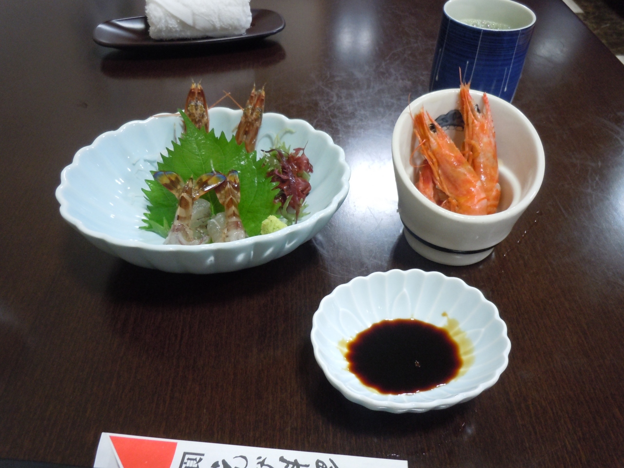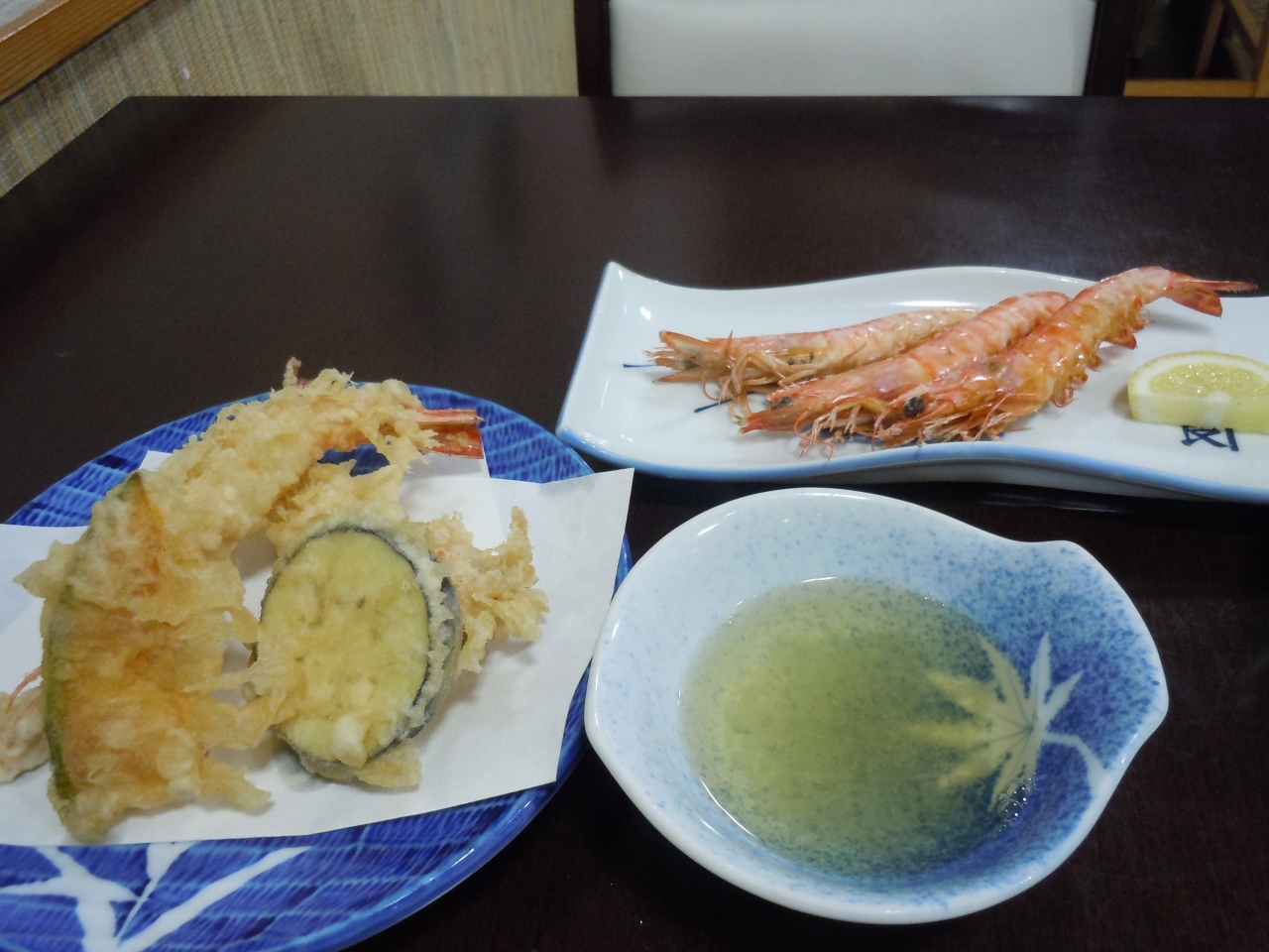 2160円の海老会席は、刺身、煮エビ、塩焼き、天ぷらに2匹毎、茶わん蒸しにもエビ入り。できた順に出てくるので、酒を飲みながら食べるにはよい。