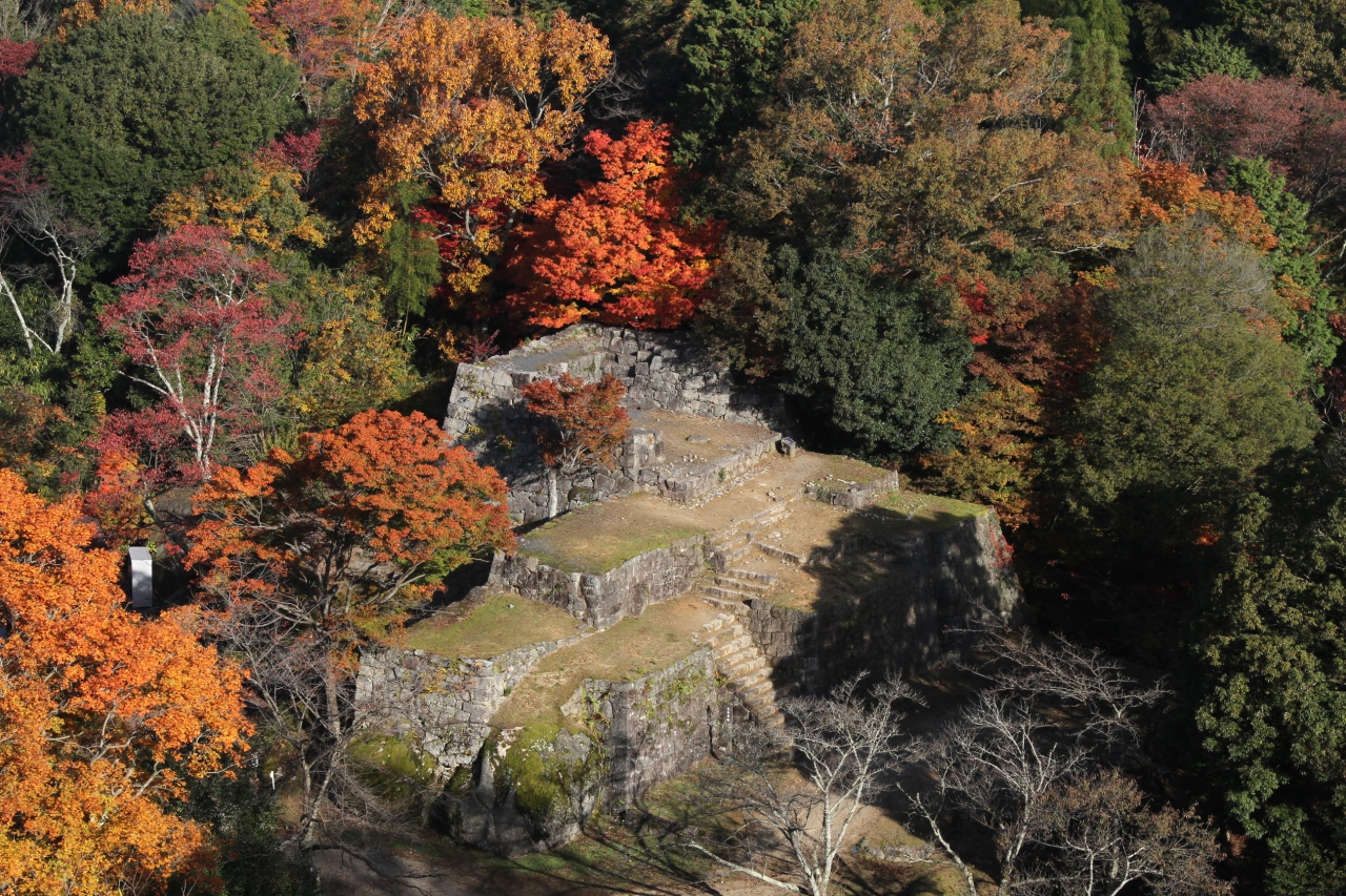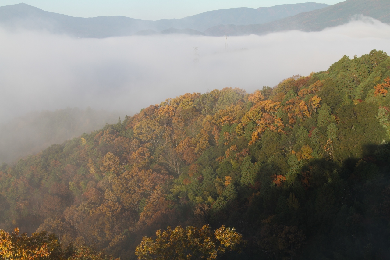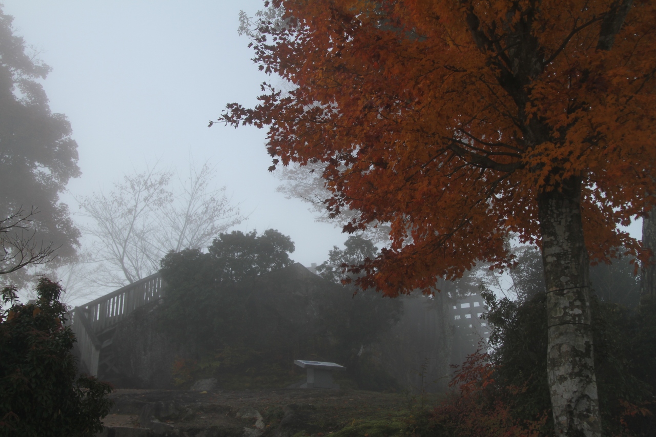 霧と紅葉と城跡と