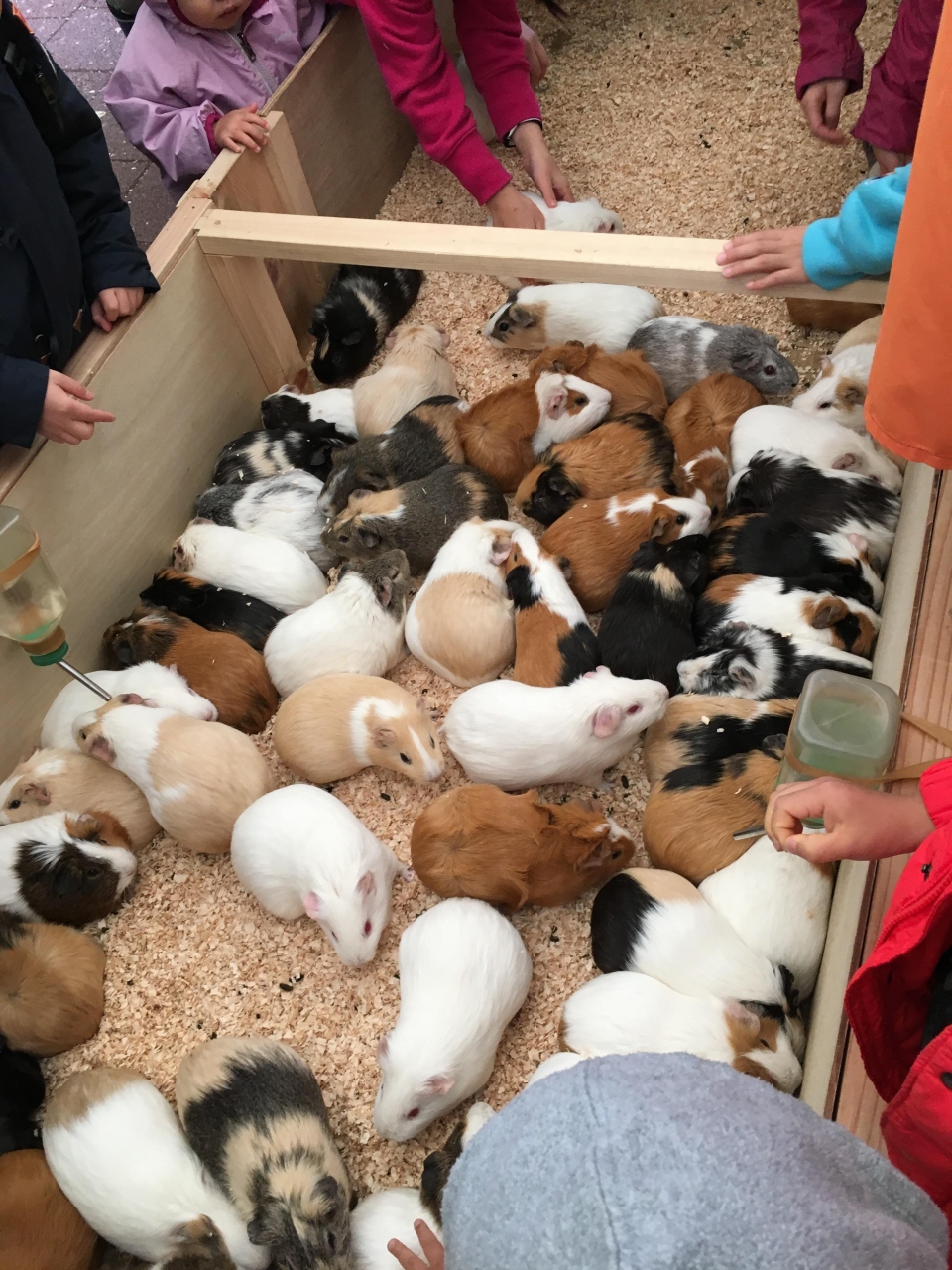 柵の中にたくさんのモルモットがひしめき合っていて、好きな子を選んでひざの上でだっこできます。