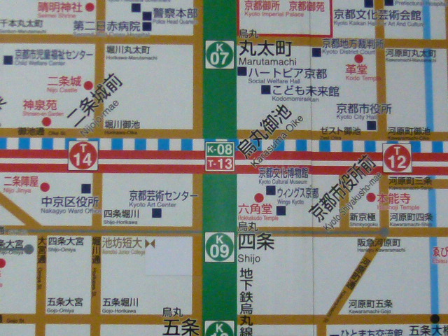 京都には地下鉄は2路線あります。簡単に言うと南北(烏丸線)と東西(東西線)で、烏丸御池で交差するようになります。