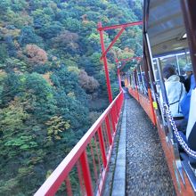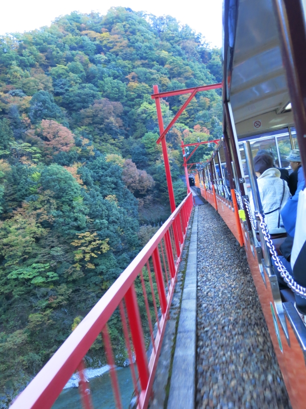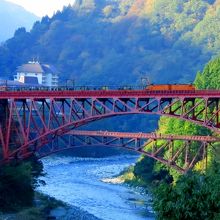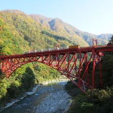 黒部峡谷にかかる赤い鉄橋、トロッコ電車で宇奈月を出て最初に渡る橋です。