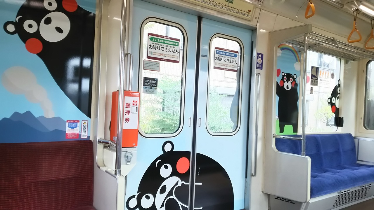 熊本電鉄を新須屋駅から乗って北熊本駅で乗り換えた。北熊本から上熊本までの電車はくまモン仕様だった。くまモンが可愛らしくラッピングされている。以前は関東を走る京浜急行で使われていたカエルの愛称で呼ばれていた電車が走っていたこともあった。