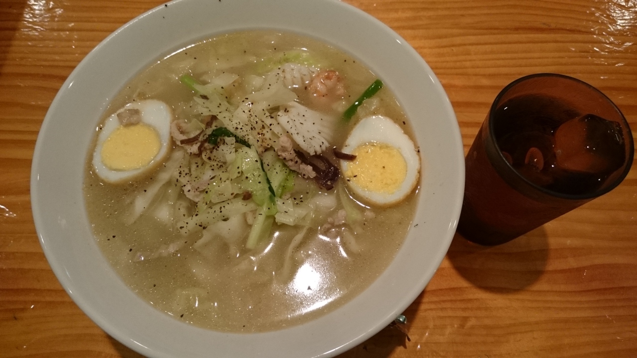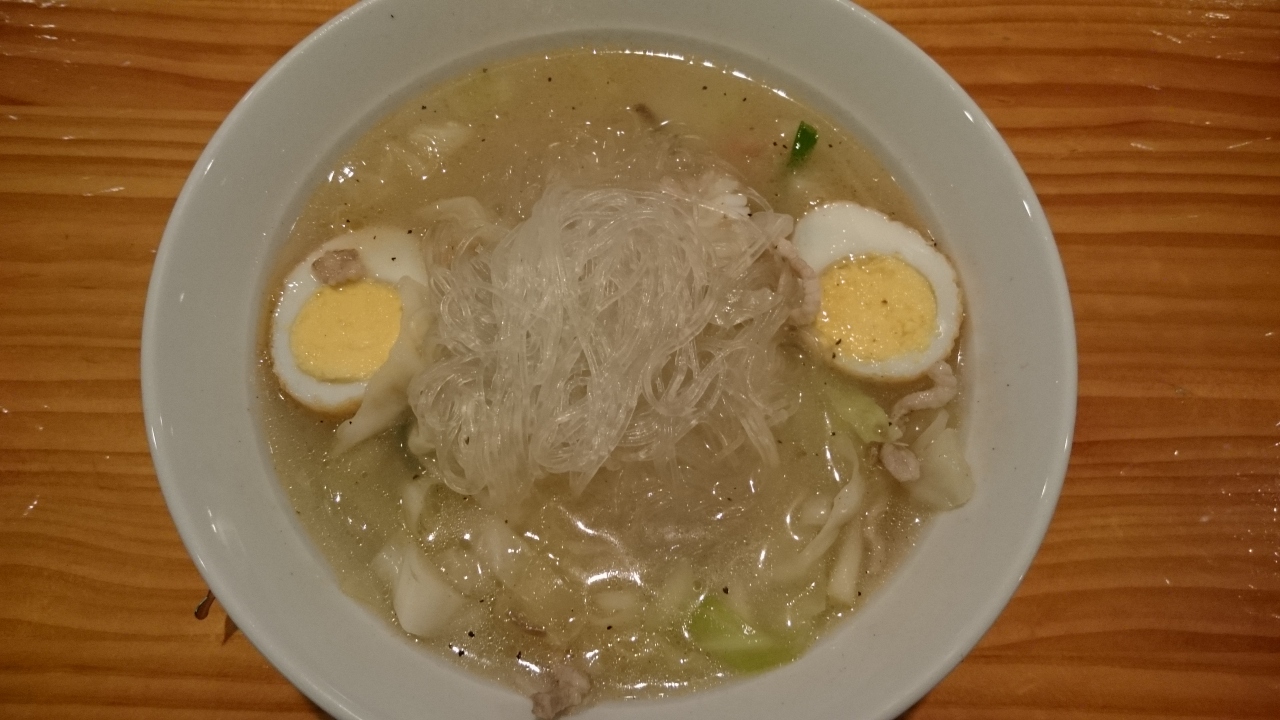 一瞬味が薄い?と思うほどのあっさりした鶏ガラとんこつ味のスープに、春雨の麺とキャベツ・キクラゲ・豚肉・エビ・イカ・揚げたゆで卵が入っていました。