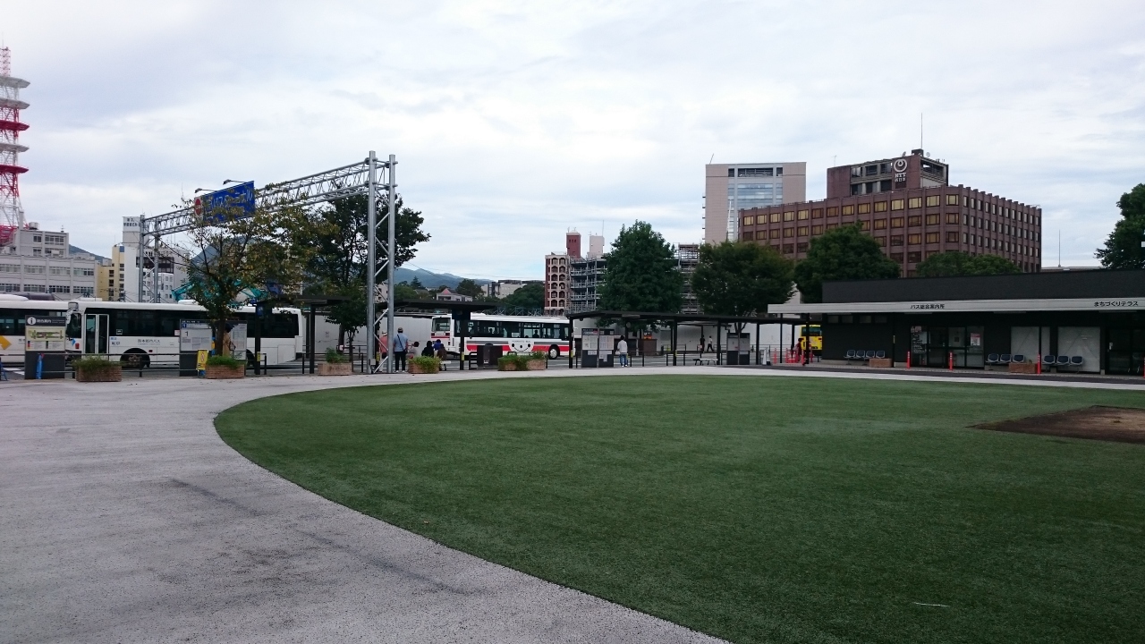 現在工事の真っ最中で、サンロード新市街前の仮の交通センターを利用しました。
