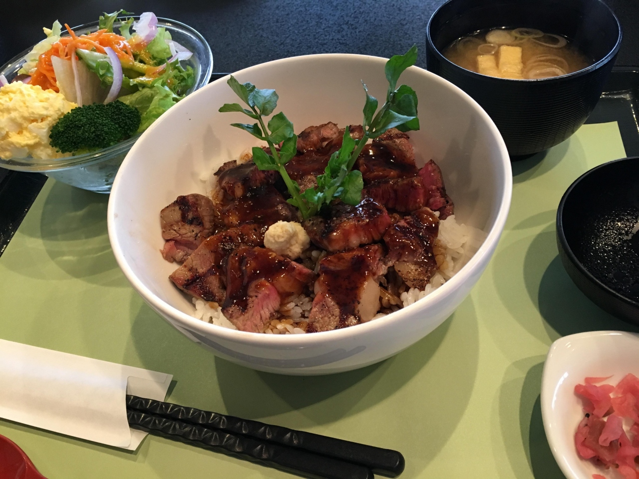 キッズメニューもあり、子供用のフライドポテト、牛乳を注文。大人はシーザーサラダとステーキ丼を注文しました。フライドポテトはやや細めで私の好みとはやや異なりましたが、息子は喜んで食べていたので良かったです。