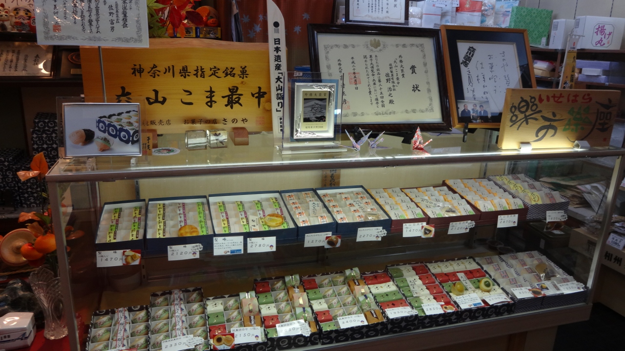 小田急線「伊勢原駅」北口を出て、バス通りを北へ進むとすぐ左側にあります。伊勢原では古くからある和菓子店で、「大山こま最中」が有名です。大山土産の「コマ」の形をしている最中です。控えめな甘さの大粒の小豆がたっぷりと入っていて食べ応えがあります。大山で有名な「大山まん志ゅう・良辨」の「こし餡」に対し、「大山こま最中」は粒餡、どちらも美味しく、甲乙つけづらいです。他に「日向薬師」を名に冠した「大山日向路」など地元ならではの和菓子もあります。