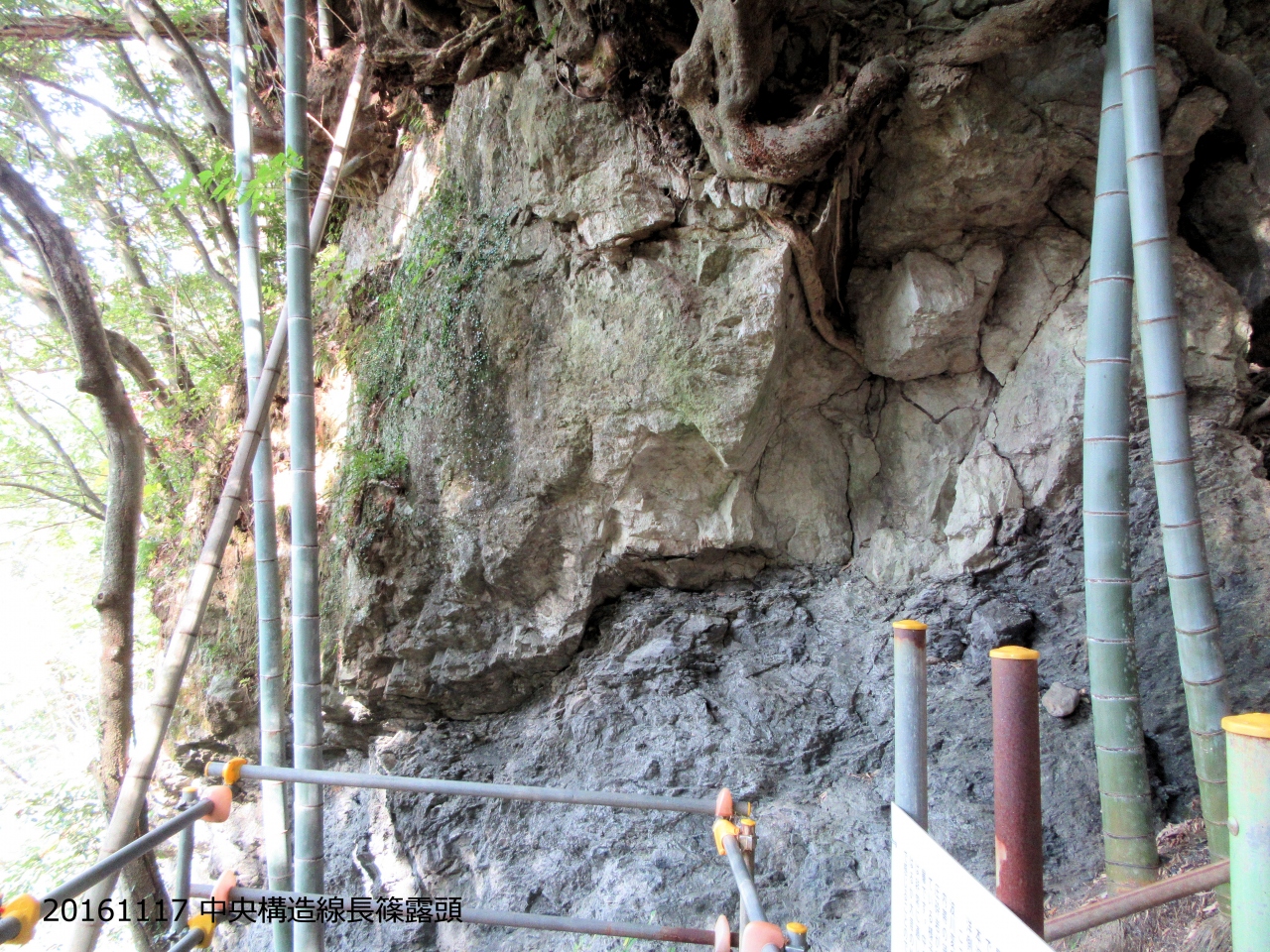 長篠城、設楽原の史跡見学の一環で、馬場信房の墓の直ぐ近くにあった中央構造線長篠露頭に行って来ました。林を分け入って川に向かって数分下っていくと、行き止まりの崖が露頭箇所で、見た目にも地層の違いが良く分かりました。幹線道路からの表示も分かりづらく、うっかりすると見過ごしてしまいそうな所ですが、一見の価値はあると思います。但し、非常に滑りやすい未整備の道ですので、十分注意して行って下さい。