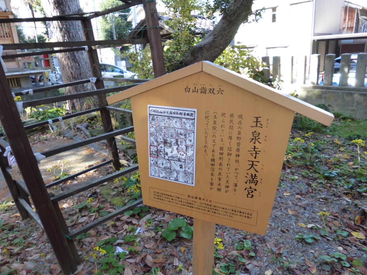 金沢市街、犀川西側の一画は「寺町寺院群」と称されるエリアで、小さなお寺が数えきれないくらい点在しています。「六斗の広見」と記された石畳の広場のすぐ近くにあるのが「玉泉寺」です。織田信長の五女・玉泉院が創設した歴史あるお寺で、案内書きを読むと、外見以上の由緒あるお寺であることがわかりました。