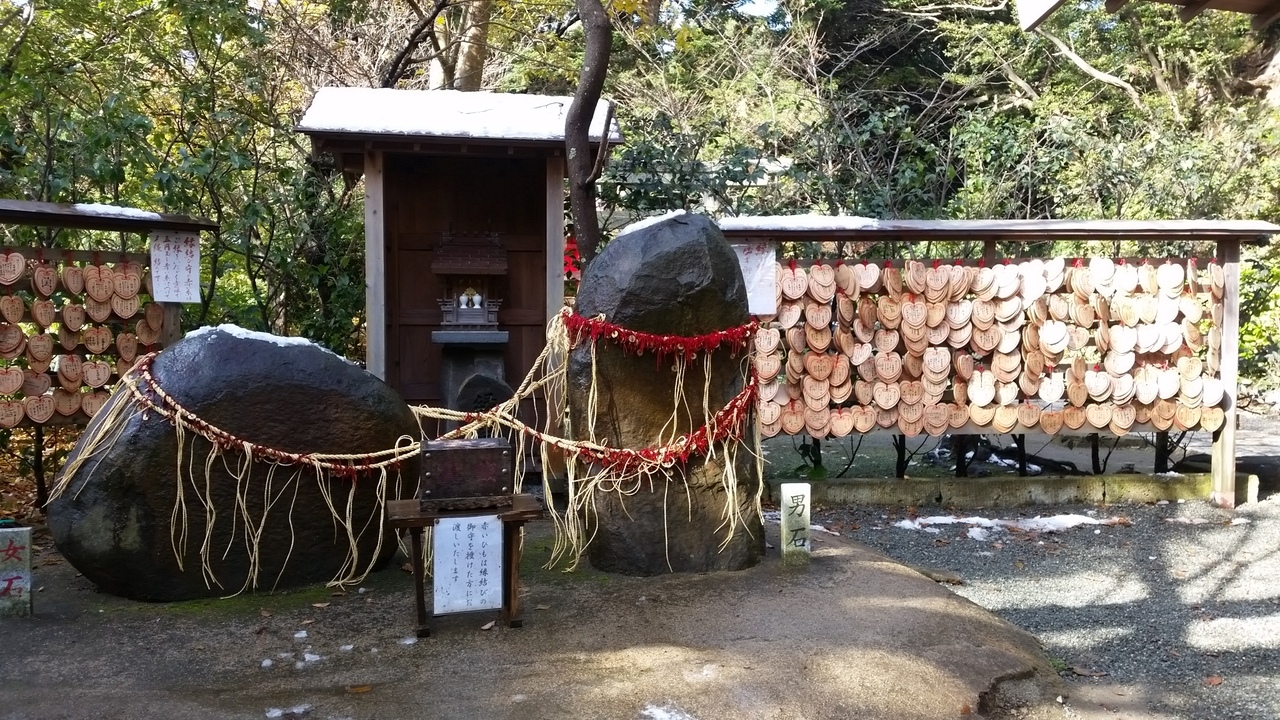 そのすぐ後ろに沢山のハート型の「縁むすび絵馬」があります。
