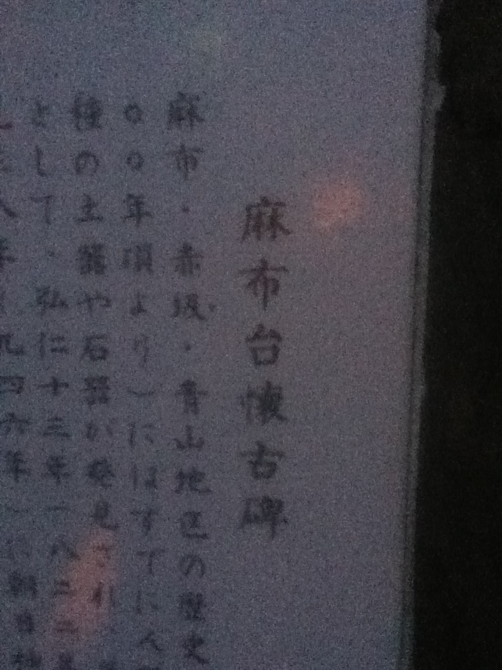 地下鉄乃木坂駅の南側、六本木ドンネルの脇にある青山公園内にある。住所を確認してから訪問したほうがいい。週末夕方、少し暗くなったが、公園内には遊んでいる家族ずれなどが数組した。日本学術会議前交差点横の入口から奥(ほぼ南側)へすすみ石段を上がっていくと小高い処に、こちらの石碑がありその説明板が周りのライトで輝いている。石碑は横長の台形に近い形状をして説明板がめいっぱいに張られている。石碑は低い石柱とポールで囲まれている。周りはやや暗く写真には取りにくかったものの、ライトで照らされ文字は良く読める。周囲には他に一人休んでいる人がいただけで静かであった。こちらの石碑は、かつてここに駐留していた歩兵第三聯隊と近衛歩兵第五聯隊の有志によって昭和62年に建てられたものである。公園の東側には国立新美術館やミッドタウン、南側には六本木ヒルズ等がある。歩兵第三聯隊や近衛歩兵第五聯隊、この界隈に関心や知識のある方は訪問するのもいいかもしれない。