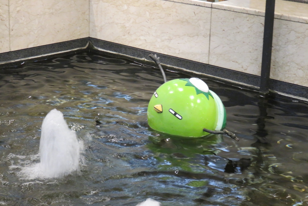 待ち合わせに良さそうな小さな噴水に「まつちカッパ」がいました。でも気に留めている人はまったくいない様子でした。