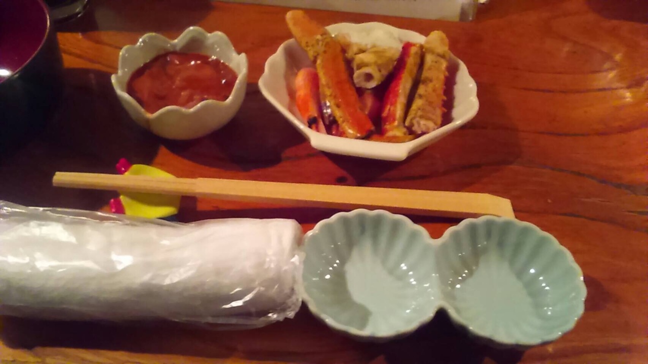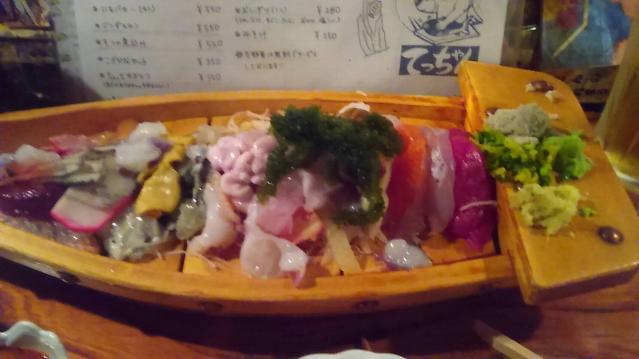 あらかじめ予約した際に舟盛りの注文をしておきます。当日の変更はできないそうです。二人でしたがそんなに食べる方ではないので一人前を予約しておきました。席に着くとカニとイカの塩辛の突き出しがセットされています。これも美味です。舟盛りはとにかくごちゃごちゃにいろんな海産物がでてきます。まぐろ、ハマチ、鯛、くじら、数の子、ミズタコ、つぶ貝、牡蠣、ほたて、筋子、うに、ほや、ナマコ、えんがわ、などわかるだけでもこれくらいありました。他に自家製餃子を頼みましたが、これもボリュームがあり美味しかったです。ビール2杯頼みましたが二人で5500円くらいでした。北海道最高です。