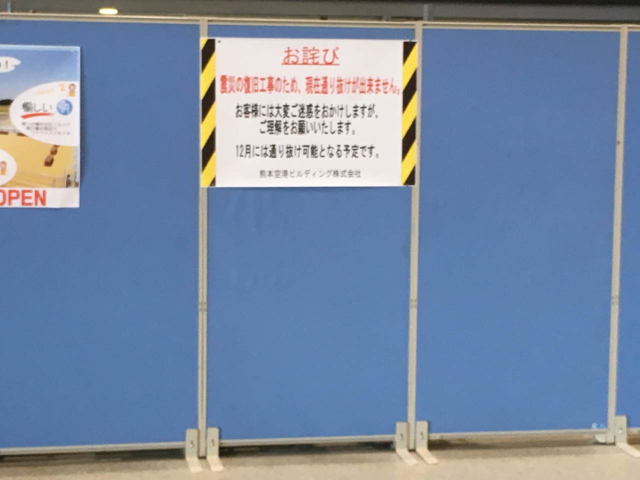 まだまだターミナル間の中に危険個所があって、外に一回でなければならなかったり工事中であったり各所に傷跡があるものの、カウンターもお土産屋さんも元気に営業されているし利用する分には全く不便もありません。展望デッキはのんびりした時間がながれていて出発まで阿蘇山などを見ながらのんびりできます。