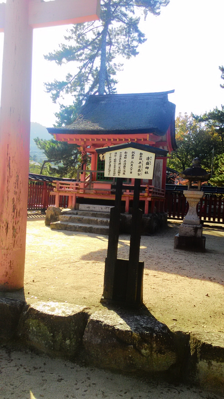 紅葉のきれいな11月中旬に宮島を訪れました。厳島神社の出口から少し海沿いを歩くと、西松原という松の木の生えた道があります。そこを奥に進んでいくと清盛神社があります。厳島神社を造らせた平清盛を称えるために建てられた神社です。