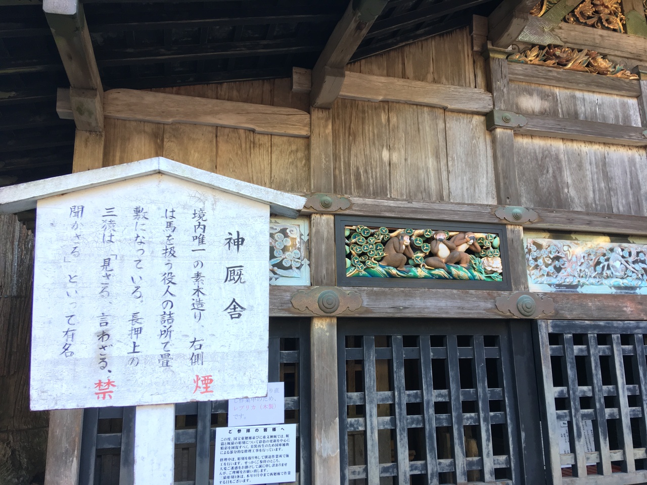 東照宮の表門をくぐって内部に入ってすぐ、左手に見えるのが神厩舎です。神馬を係留するところで、日光東照宮でマストビジットの三猿の彫刻が見られる場所でもあります。3016年現在、三猿を含む彫刻は修復中であり、三猿のみレプリカが取り付けられており、それ以外は取り外されていました。