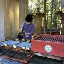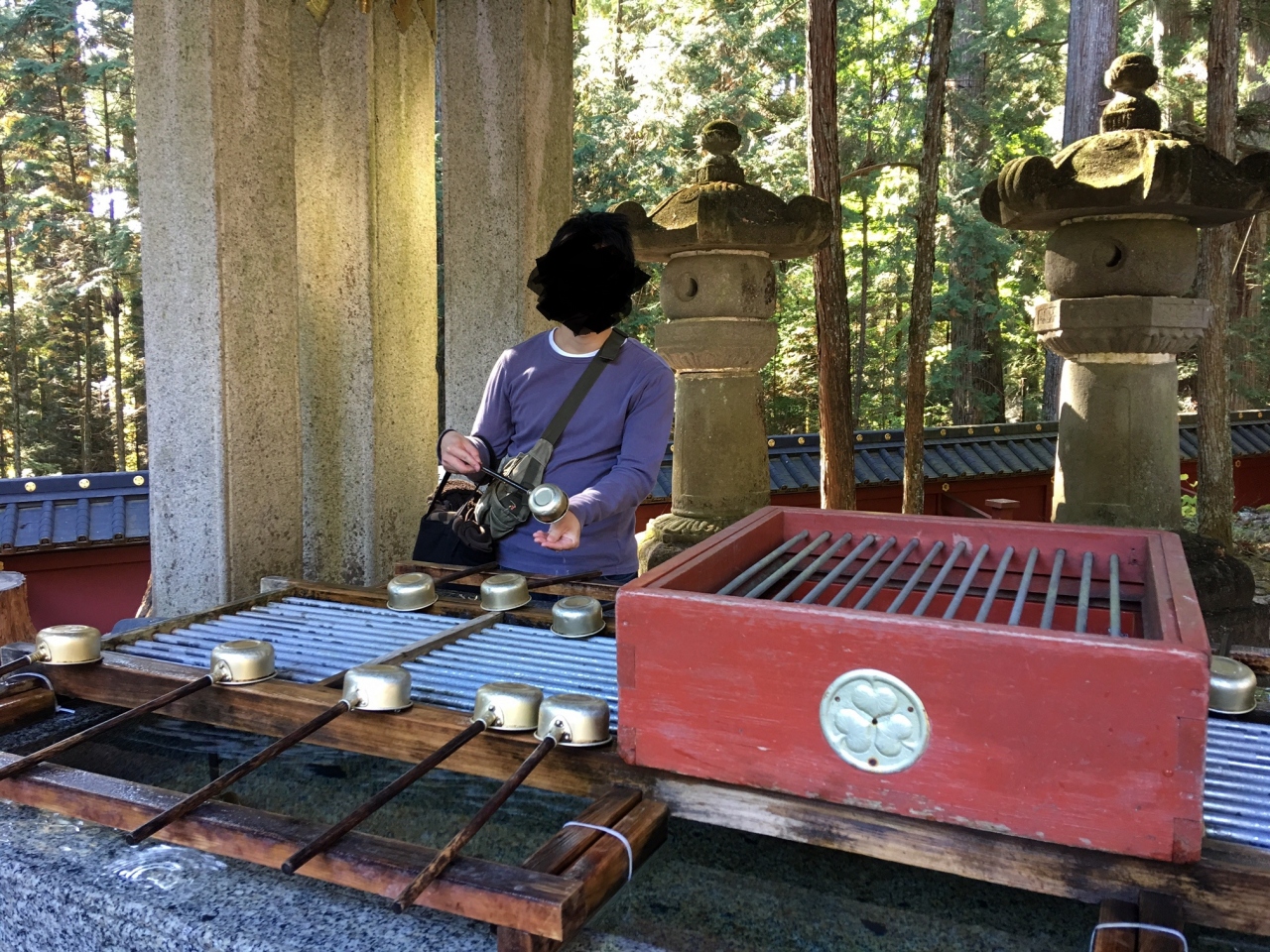 陽明門に入る手前で、口を漱ぎ、手を洗い清めるところで、水盤の周りにはひしゃくが置いてありました。解説によると、1618年に佐賀藩の鍋島勝茂による奉納とのことで、400年ほど使われていることになり、想像するに、多くの要人や歴史上納人物がこの水盤で清めを行ったのではないでしょうか。