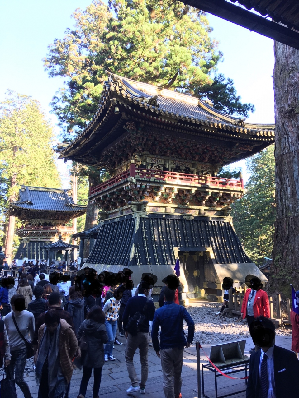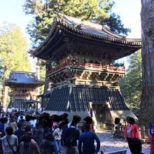 御水舎で口を漱いで手洗いを行った後、陽明門に入る手前に2か所ある建物が鼓楼です。陽明門を守るように建てられており、大きさに圧倒されました。近くには大きな木々が植わっており、紅と樹木の茶色と緑とのコントラストがよかったです。